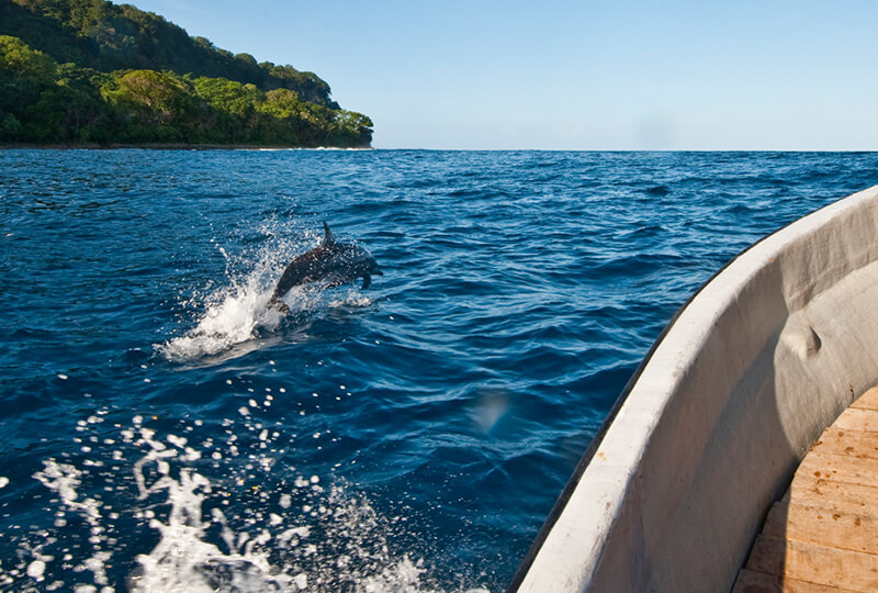 ツアーボートにイルカが寄ってくる――――そんな経験をした方、ソロモン諸島ではなんとその先があるのです! サボ島のまわりには、人なつっこいイルカが住みついており、モーターボートにつかまりながらイルカと一緒に泳げちゃうツアーも!